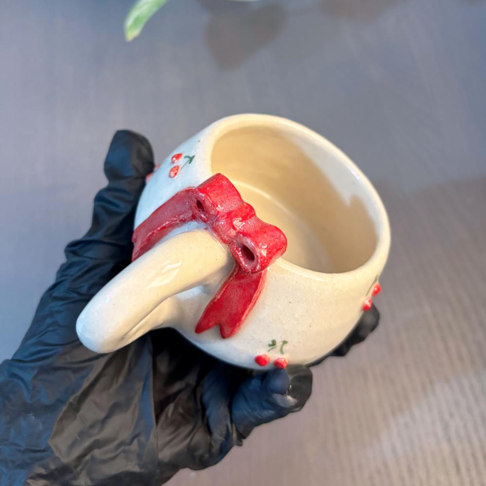 حبيت يكون مقبض اليد للكوب سميك ليعكس لطافه وجود حبات الكرز الصغيره و يميز شكل الفيونكه في نفس الوقت ♥️