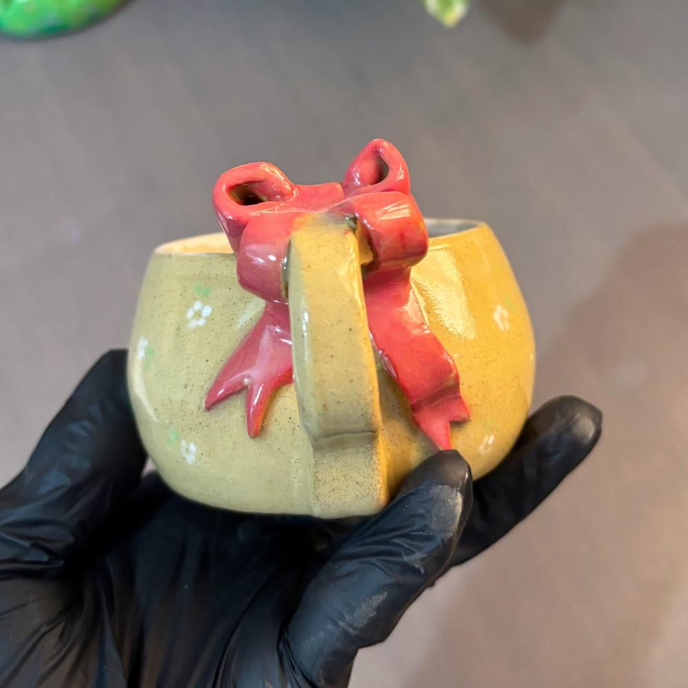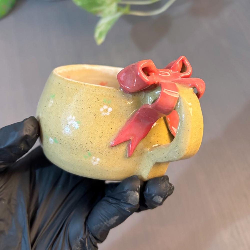 الكوب بتصميم الفيونكه الورديه نفذ بالطين الصخري بلون الرمال البيج